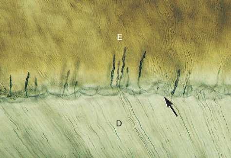 Figure 1.8 Microscopic view of scalloped dentoenamel junction (DEJ) (arrow) E, Enamel; D, dentin.