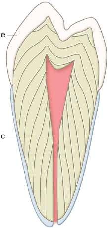 Figure 1.11 Pattern of formation of primary dentin. This figure also shows enamel (e) covering the anatomic crown of the tooth and cementum (c) covering