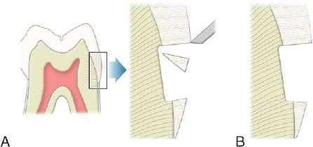 Figure 1.4 (A) Enamel rods unsupported by dentin are fractured away readily by pressure from hand instrument. (B) Cervical preparation showing enamel rods supported by dentin.