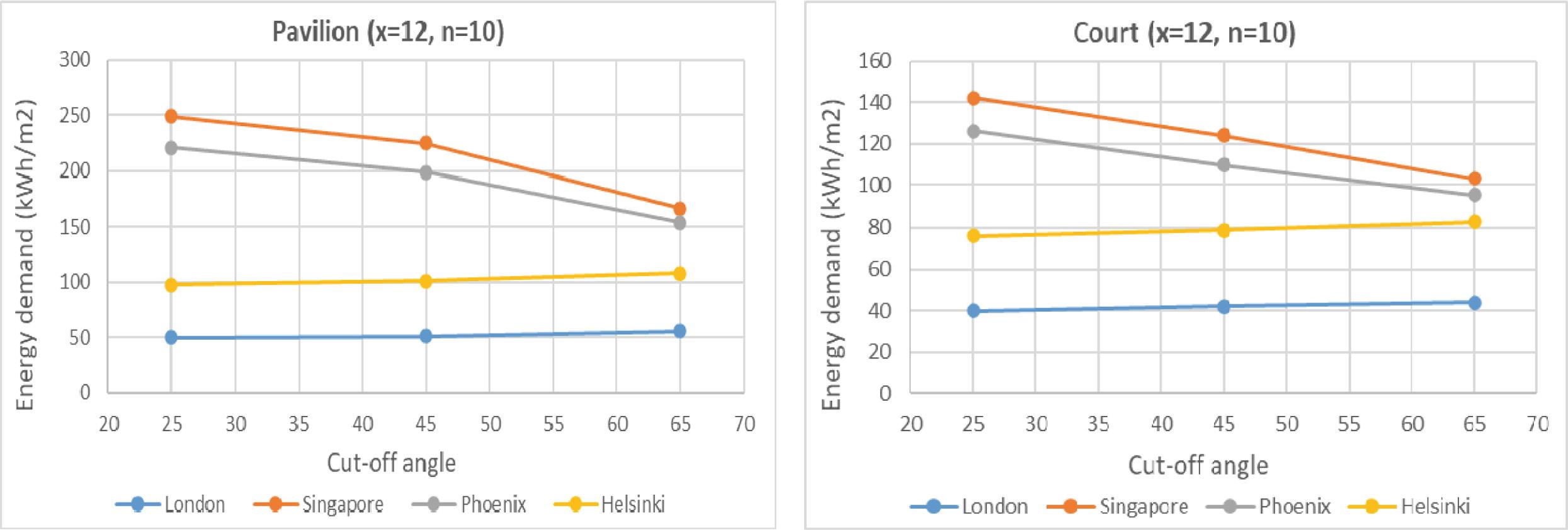 AmongthecasesshowninFig. 3,thefirstcasethatiscomposedofpavilionform with θ = 25°,x = 12mandn = 6showsarelativelyabnormalhighenergydemandfor thePhoenixandSingaporecasestudies.Inthisspecificinstance,theenergydemands forthesetwocasestudiesareunexpectedlymuchhigherthaninLondonandHelsinki, andtheirpercentagedifferencesarenotfollowingtheabove-mentionedtrend.Infact, theenergydemandforPhoenixandSingaporeare338%and392%higherthanLondon, respectively,whiletheyhaveonlya12%differencebetweeneachother.Thissubstantial differenceisduetoacombinationofthreefeatures,(i)itisapavilion,(ii)ithasa smallplandepth,and(iii)ithasalowcut-offangle.Thepavilionbuiltformconsists ofsmallerinternalspacecomparedwithotherbuiltforms[4],therefore,itsenvelope energyefficiencyismorevulnerabletooutsideweatherconditions.Inaddition,ithas asmallplandepththatmakesitevenmoresensitivetothechangeshappeningoutside thebuilding,andfinally(andmoreimportantly),thelowcut-offangleincreasesthe coolingloadofthebuildinginhotclimates(i.e.,PhoenixandSingapore).Aspreviously demonstratedinFig. 2,inhotclimates,theincreasingcut-offanglewoulddecrease coolingdemandofbuildings.Therefore,inplanswithalowcut-offangle,thedifference betweenenergydemandinhotclimatesandthecitiessuchasLondonandHelsinki(that requireheatingload)areverysignificant.Byincreasingthecut-offangle,thedifference issignificantlyreduced(e.g., θ = 65°).