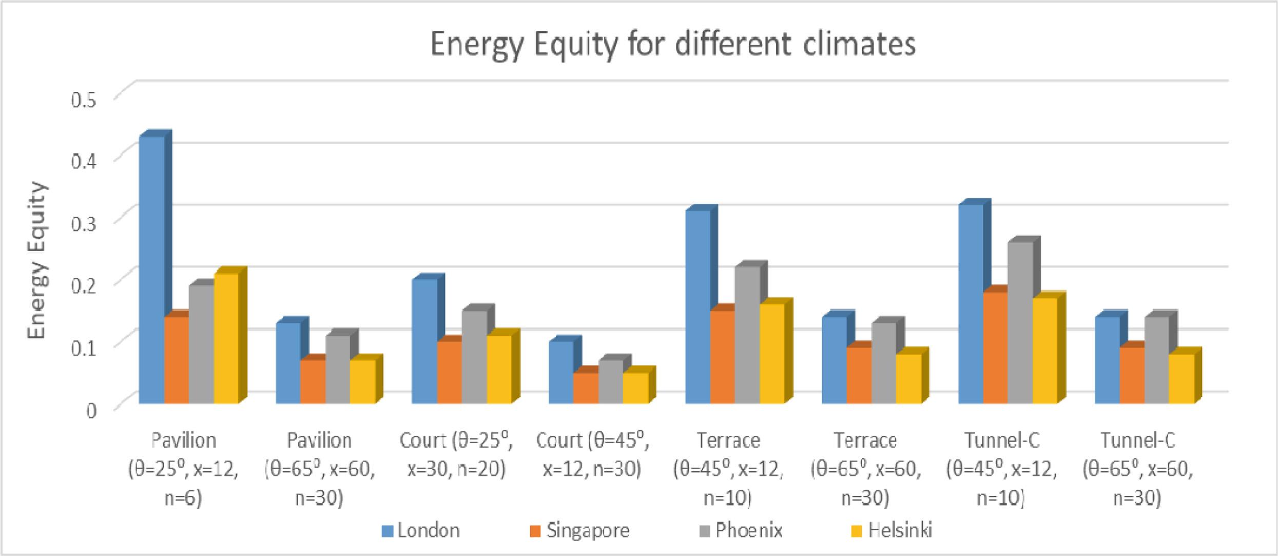Fig.4. ComparisonoftheEnergyEquity(EE)ofthebuiltformswithsimilargeometricparameters indifferentclimates.