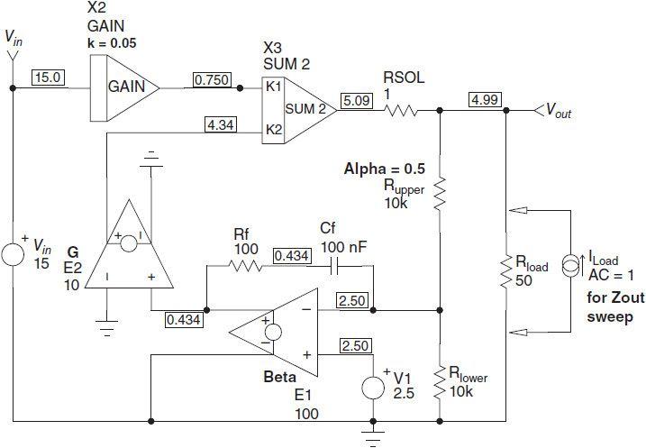 Figure1.2finallyshowshowourresistiveconvertercouldbeimproved,let’ssayforthe5-Vsection.Theerroramplifierismadeviaavoltagecontrolledvoltagesource(Eprimitive)andfeaturesagainof10kor(80dB),20log10(10k)Oneinputreceivesthevoltagereferencewhereasthe otherone,theinvertinginput,isbiasedbyaportionoftheoutputvoltageThisisactuallyalinearregulator,however,limitedintheinputvoltage rangesinceVinshallbeaboveVoutbyaVbe,atleast,toguaranteeaproperdriveforQ1IfVoutisbelowthetarget(5Vinourexample),E1 outputincreasesandstrengthensQ1biascurrent:VoutgoesupOntheotherhand,supposetheloadhassuddenlybeenreduced,thereforeVout exceeds5VThankstoE1,Q1biascurrentgoesdown,reducingtheoutputvoltageuntilregulationismetagain
