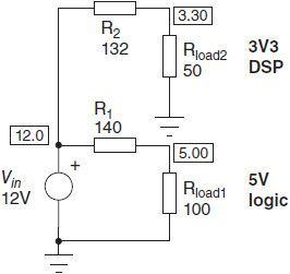 141AssociatingResistors Figure11portraysthesimplestoptionadesignercanthinkof:resistivedividersIfourDSPconsumes66mAover33V,thenitcanbereplaced bya50-Ωresistor,thesameasforour50mA,5-Vlogiccircuitviathe100-ΩresistorFroma12-Vsource,wecanthencalculatethedropping resistors: