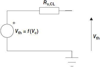 1.4.3DerivingUsefulEquationswiththeLinearRegulator Figure12isinterestingbecausewecanuseittoderivegeneralstatements,pertinenttotheclosed-loopworldwearegoingtoenter,linear,or switchedSupposethatweremovetheerroramplifierandreplaceitbyafixedvoltagesourceof577V,ouractualopampoutput(lookatFig12 values),asFig14showsTheregulatorbecomesasimpleemitter-followercircuit,affectedbyanoutputimpedanceandanoutputvoltageAs such,itcanbedescribedwithitsequivalentThéveningenerator,whatFig.1.5suggests.Rs,OLrepresentstheopen-loopoutputimpedanceand Vth,thevoltagedeliveredwhenbiasedbyacontrolvoltageVc,ourfixed577VintheapplicationLetusnowusethisrepresentationandredraw ourclosed-loopregulatoraroundit,ignoring,fornow,theinputvoltagecontribution