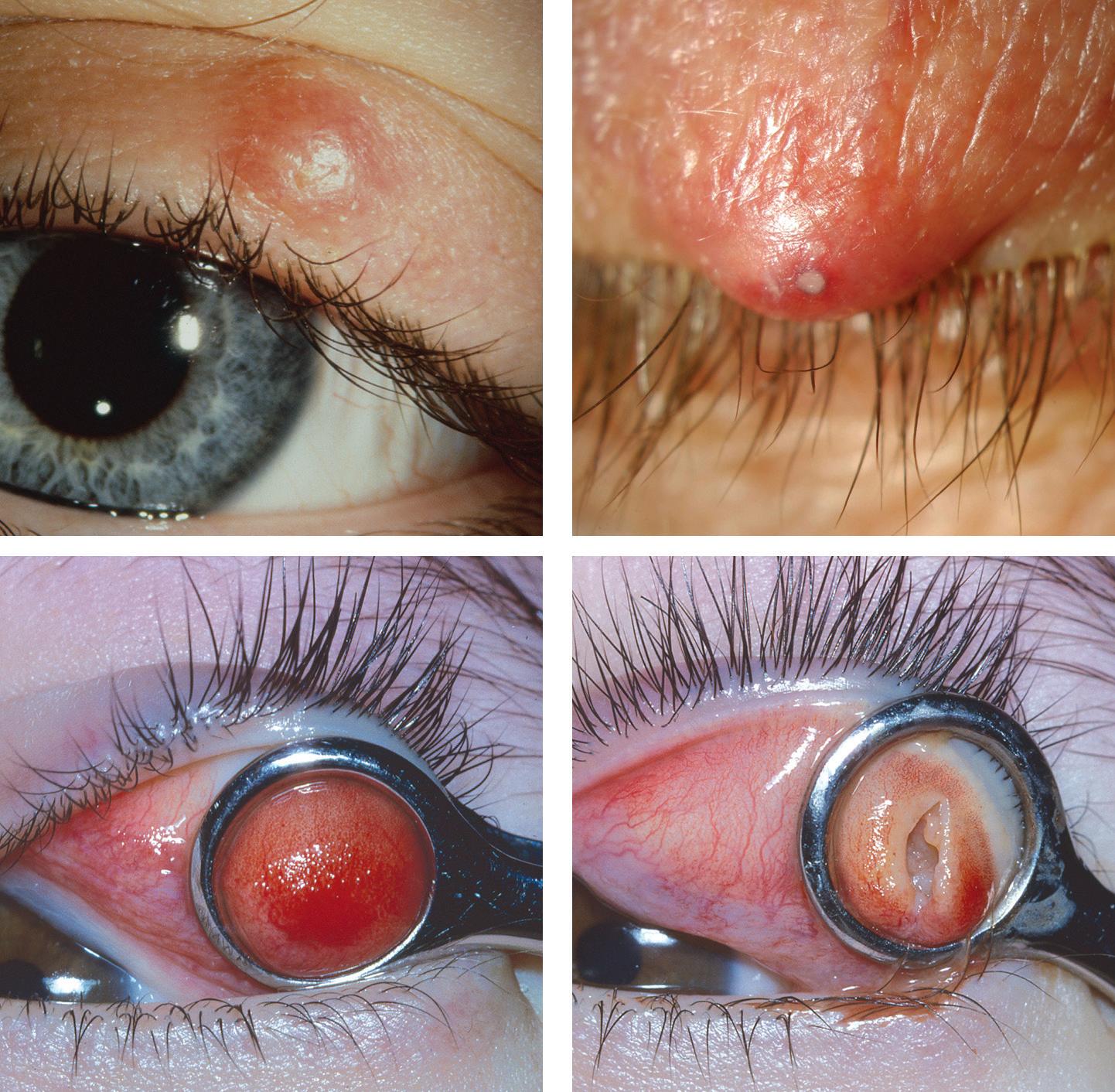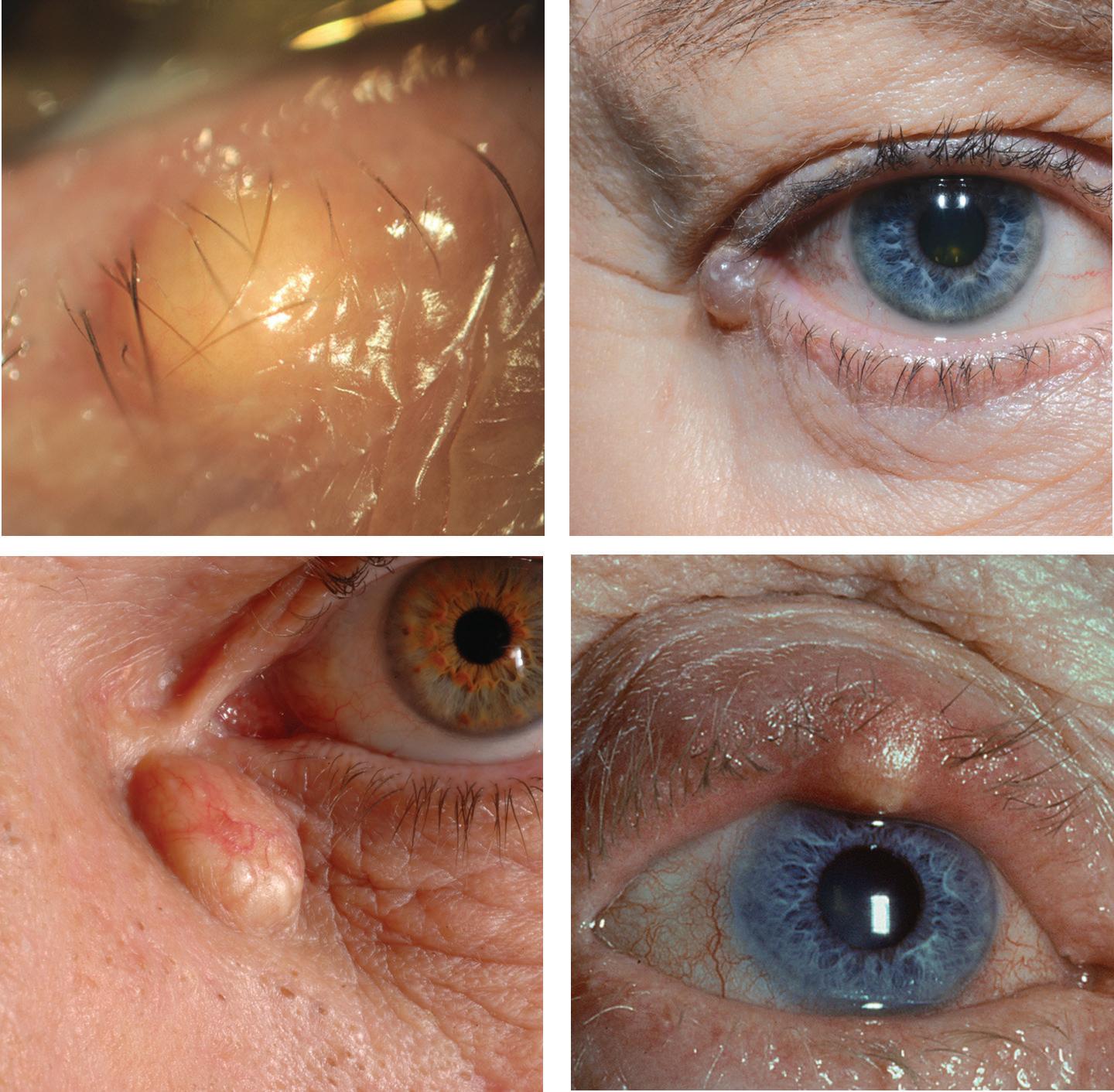 ◾ Epidermal inclusion cyst: slow-growing, firm, round lesion containing keratin; located away from the lid margin. Caused by implantation of epidermis into dermis following trauma or surgery.