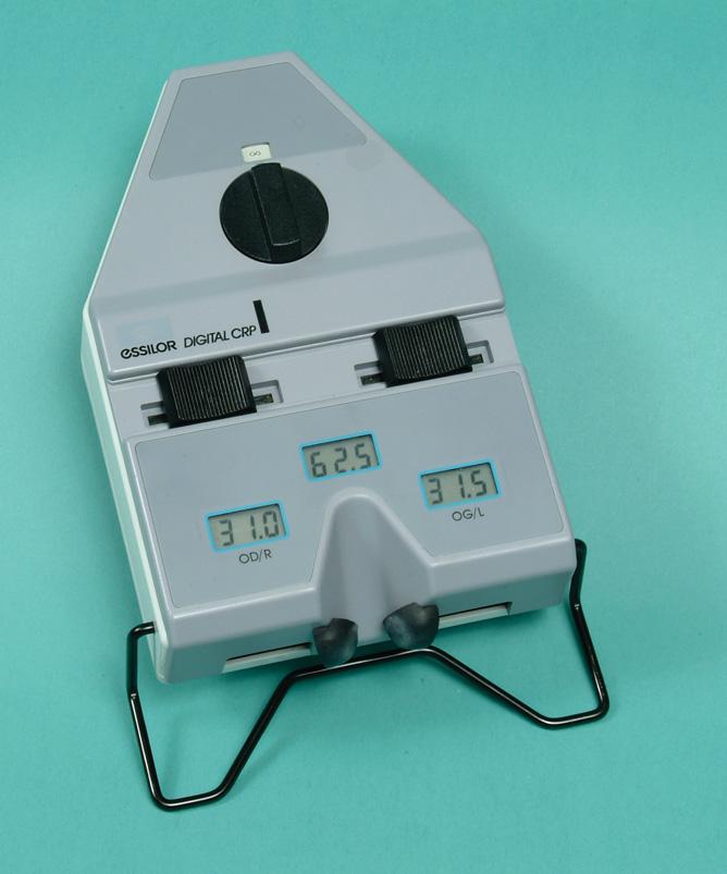Figure 3-6. The digital version of Essilor’s pupillometer displays monocu lar PDs for the right and left eyes, as well as the binocular PD. It can be set to measure distance or near PDs.
