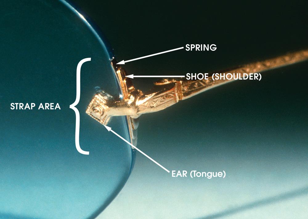 frames. Rimless construction varies considerably. The “classic” rimless point of lens attachment contains a strap or straps. This is the part of the mounting that contacts the front and back surfaces and the edge of the lens, holding the lens in place. The traditional strap consists of the shoe and the ear.