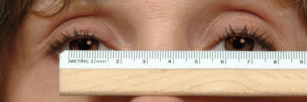 When the PD is to be measured, the dispenser should be positioned at a distance of 40 cm (16 inches) directly in front of the subject, with his or her eyes at the same vertical level as those of the subject. The PD rule is positioned across the subject’s nose with the measuring edge tilted back so that it rests on the most recessed part of the nose. The dispenser holds the PD rule between thumb and forefi nger and steadies the hand by placing the remaining three fi ngers against the subject’s head. The dispenser closes the right eye and sights with the left (Figure 3-1). The subject is instructed to look at the dispenser’s open eye while the dispenser lines up the zero mark of the rule with the center of the subject’s pupil.