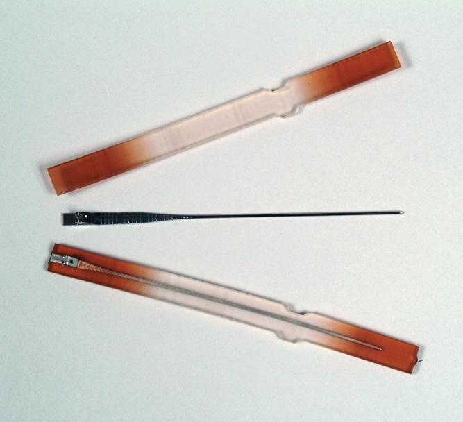 Carbon fi ber material is used to create a thin, strong frame. This material is made from strands of carbon fibers combined with nylon. It is not adjustable and is consequently used mainly for frame fronts. The temples are generally made from another material. In other words, if a carbon fiber frame does not fit well in frame selection, do not plan on making it fit well later on. The principle advantage is the light weight that can be achieved. Carbon fiber is 60% the weight of cellulose acetate. Not only is the material light weight, but because of its strength, it can also be made thinner. Since carbon is black, frame colors will be opaque and are limited. Some problems may be encountered with breakage in cold weather. Because of the thermal problems, it is imperative that the material not be directly worked with right after it has been outside. (For more information on working with carbon fiber material, see Chapter 7, Insertion into a Carbon Fiber Frame.)