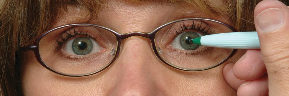 directly in front of the subject’s right eye and at the normal distance. The zero mark is lined up as usual. The dispenser then moves sideways until the good eye is positioned in front of the subject’s left eye and the measurement is read. Unfortunately this method can easily lead to parallax errors. The most desirable solution for someone with this difficulty is to use another type of instrument that only requires the use of one eye.