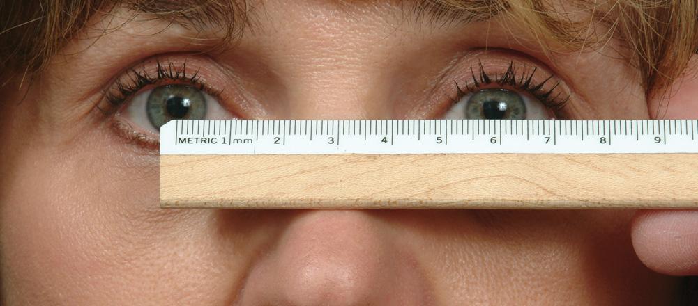 Figure 3-2. The dispenser uses his or her left eye to establish the zero point of the PD rule in the center of the pupil of the subject’s right eye as shown here. The subject is looking at the dispenser’s left eye. Next the subject looks at the dispenser’s right eye. The dispenser uses his or her right to read the pupillary distance at the center of the subject’s left eye. (This is not what is seen in this photo.)