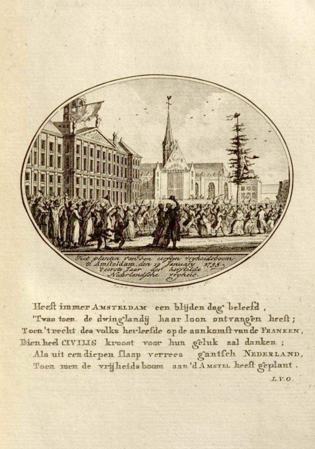 Het planten van den eersten vryheidsboom te Amsteldam, den 19 January 1795, ’t eerste Jaar van de herstelde Nederlandsche