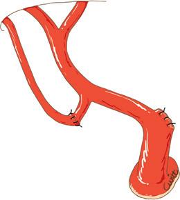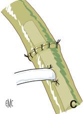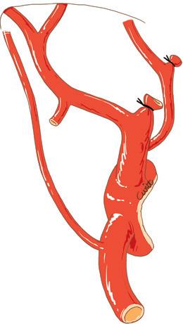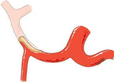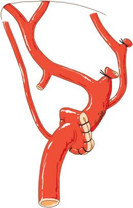 B. Arteria epatica destra che ha origine dall’arteria mesenterica superiore. Plastica secondo Gordon [14] a. Vengono tagliati dei patch d’aorta a “8” intorno agli osti dei due tronchi arteriosi. b. Una cerniera, trattenuta tra i due arrotondamenti, permette di accostare gli osti l’uno all’altro. È l’estremità distale dell’arteria mesenterica superiore che ormai funge da unico asse di impianto.