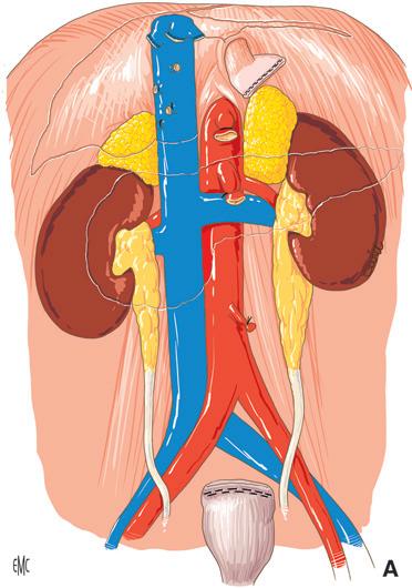 I segmenti retro- e sottoepatici della VCI vengono poi ripuliti dal tessuto cellulare lasso che li ricopre. Il legamento epatocavale viene reciso per fornire tessuto alla VCI retroepatica perché è lì che si porterà l’anastomosi. La vena surrenale destra viene legata al suo sbocco nella VCI, con questa legatura assicurata da un punto a “x”. La perfetta tenuta dell’asse cavale viene infine verificata obliterando il suo orifizio superiore e iniettando, attraverso l’orifizio inferiore, del liquido di conservazione freddo, a bassa pressione. Le estremità prossimale e distale della vena cava retroepatica vengono lasciate aperte o chiuse con una fila di graffette a seconda della modalità di impianto scelta.