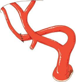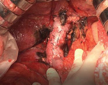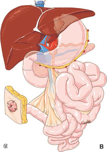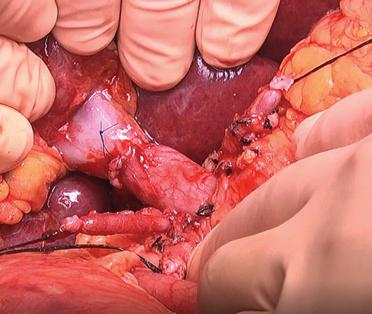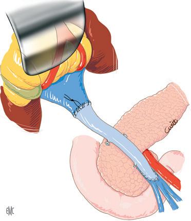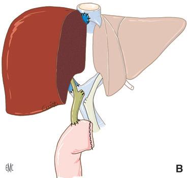 L’arteria epatica destra di solito nasce dall’AMS. Il peduncolo epatico comprende quindi due arterie separate che conviene unire. Questo lavoro è meglio farlo ex situ. Sono stati riportati molti metodi di ricostruzione: la tecnica originale, descritta da Gordon et al. [14] (Figg. 3C, D), consiste nell’anastomizzare in continuità il tronco celiaco e l’AMS e poi nell’impiantare l’estremità distale del segmento dell’AMS asportato. Questa tecnica è fonte di piegamenti. Si preferisce anche il reimpianto diretto dell’arteria