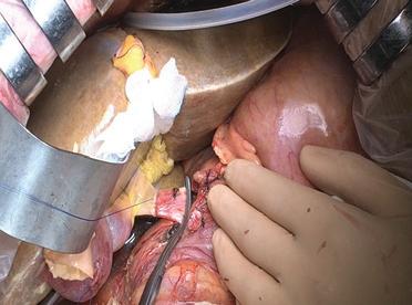 La via d’accesso è quella di un trapianto di fegato standard, trasversale con fenditura verso il processo xifoideo.