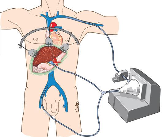 Figura 2. Il fegato nativo viene talvolta rimosso insieme al segmento retroepatico della vena cava inferiore. Il mantenimento del flusso cavale inferiore e del flusso splancnico è assicurato dal posizionamento di uno shunt venovenoso extracorporeo attivo. La puntura venosa dei territori della vena cava inferiore e dell’area splancnica viene eseguita rispettivamente attraverso la vena safena interna destra e il tronco portale o la vena mesenterica inferiore. Il ritorno avviene nel territorio della vena cava superiore attraverso la vena ascellare.