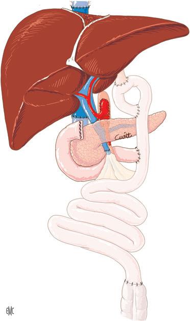 Drenaggi di Redon o una lama vengono posizionati dietro l’anastomosi biliodigestiva. La chiusura viene eseguita dopo aver assicurato il posizionamento favorevole della vena porta dell’innesto e l’assenza di attorcigliamento dell’anastomosi sovraepatica.