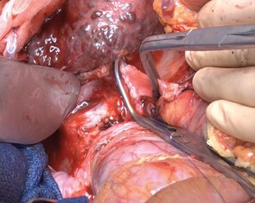 Un TEAO destro richiede l’esecuzione di un’epatectomia destra [48] . La sezione parenchimale, eseguita sotto clampaggio selettivo dei vasi del peduncolo destro, passa a destra della vena epatica media. La vena epatica destra viene temporaneamente legata. L’epatectomia destra espone quasi l’intera vena cava retroepatica.