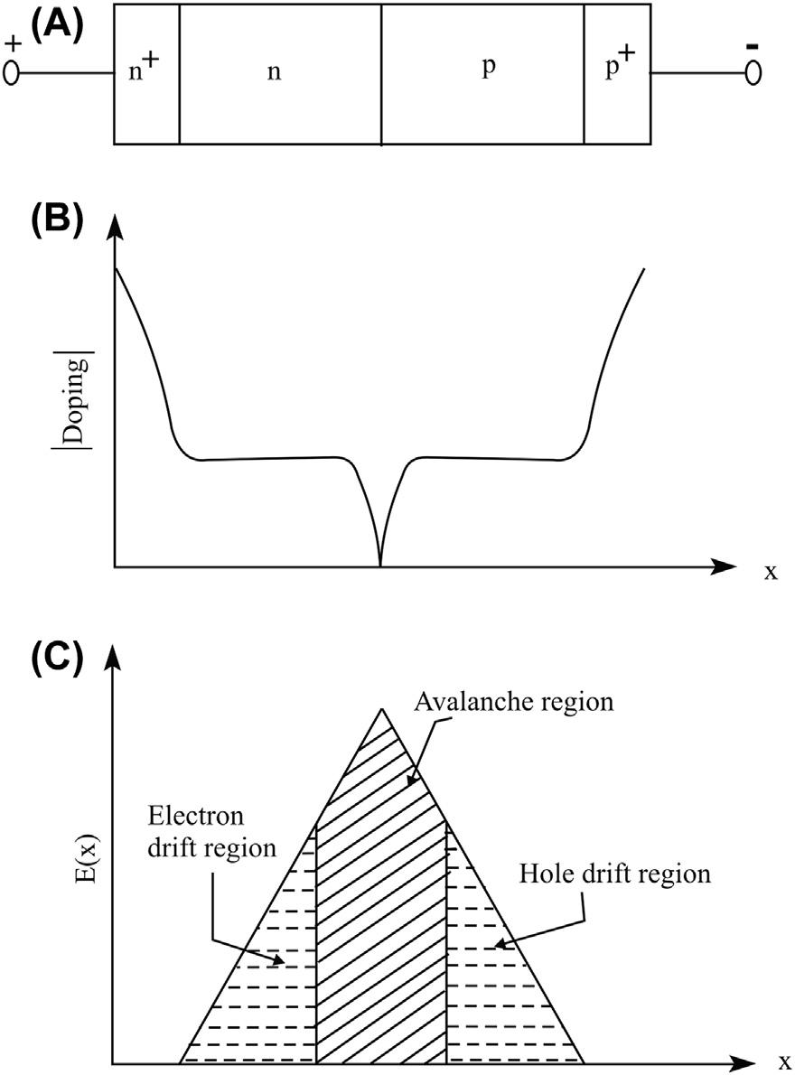 FIG.1.4 (A) Double-driftregion(DDR)IMPATTdiode structure, (B) dopingprofile,and (C) Fieldatbreakdown showingtheavalancheanddriftregions.