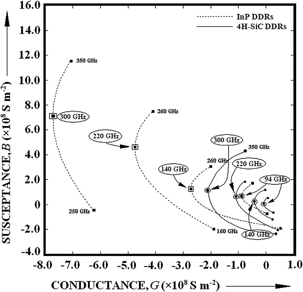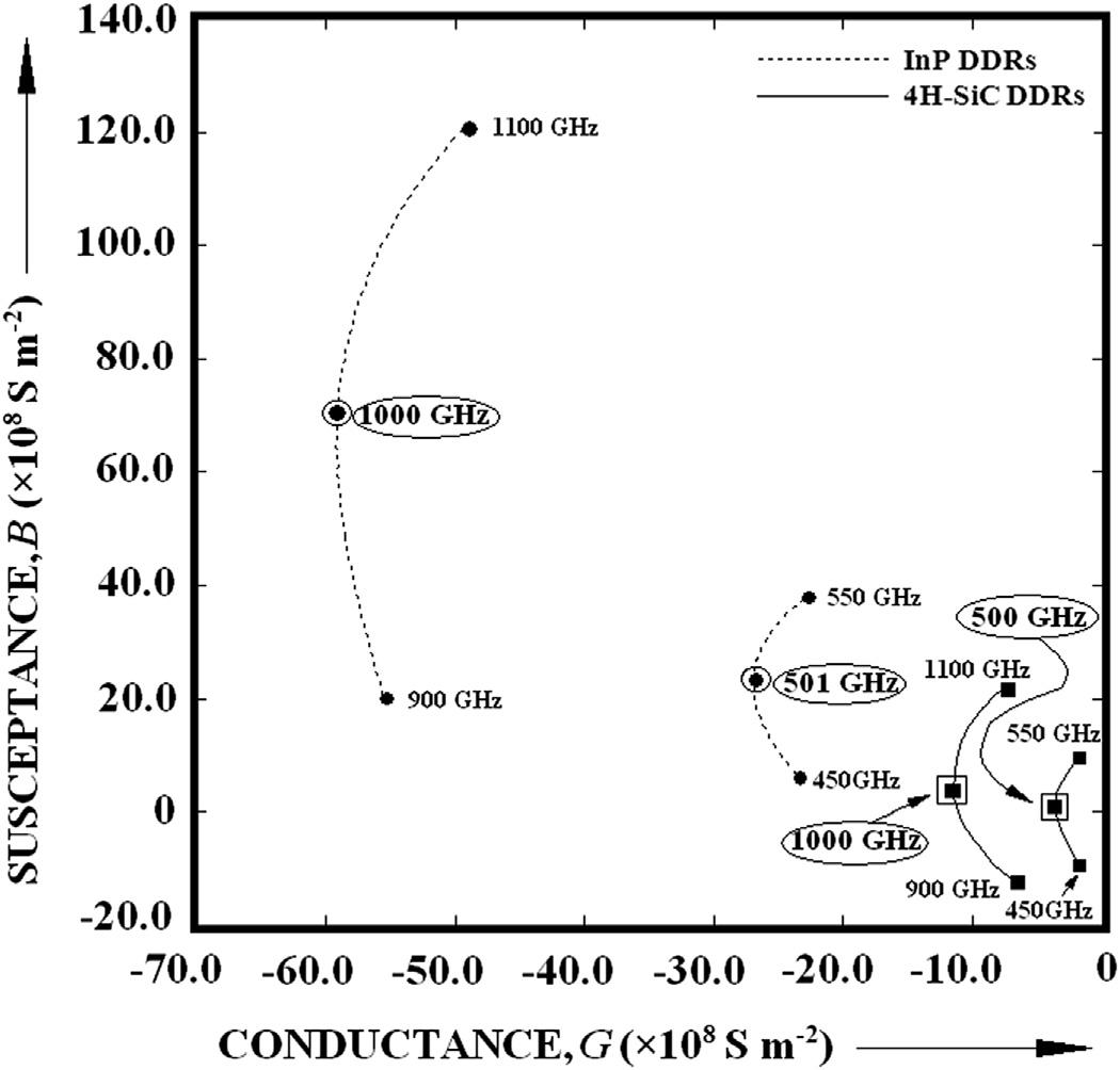 FIG.1.13 Admittance(G-B)plotsofdouble-driftregion(DDR)IMPATTdevicesmadeofInPand4H-SiC (optimumfrequenciesinTHzbandasmarked).
