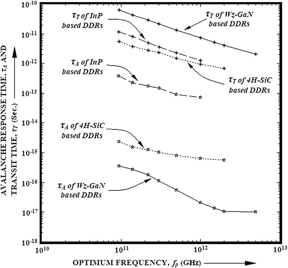 FIG.1.6 Plotsofavalancheresponsetimeandtransittimeagainstoperatingoptimumfrequencyofdoubledriftregion(DDR)IMPATTsbasedonGaN,InP,and4H-SiC.