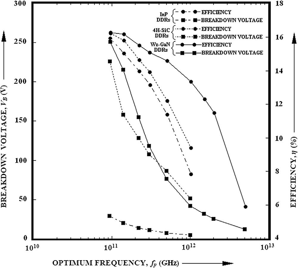 TheRFperformanceofSiandGaAsDDRdevices withrespecttotheiref fi ciency(h )canbecompared atdifferentfrequenciesintherangeof94 500GHz from Fig.1.8 .Itisobservedthattheef fi ciencyofSi DDRsishigherthanGaAsDDRswithinthefrequency