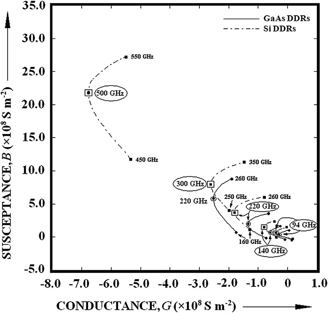 Fig.1.11 showsthesmall-signaladmittance,i.e., conductanceversussusceptance(G-B)plotsforGaAs andSiDDRIMPATTs.Theseplotsshowthatthe optimumfrequenciesforGaAsdevicesare94,140, 220,and300GHz,whilethoseforSidevicesare94, 140,220,300,and500GHz.Theadmittanceplots shownin Fig.1.11 clearlyindicatethatSiDDRIMPATTs canbeusedupto0.5THzincontrasttoGaAsIMPATTs.