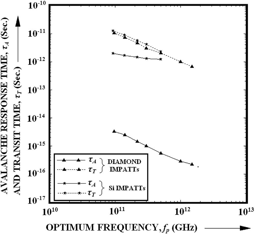 FIG.1.7 Plotsofavalanchetransittimeandtransittimeversusoptimumfrequencyofdiamond-andSi-based IMPATTs.