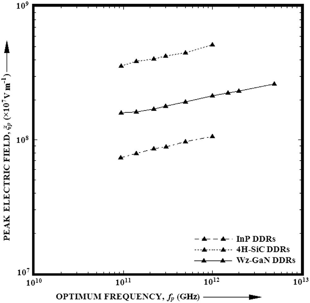 FIG.1.9 Plotsofpeakjunction field xP ofdouble-driftregion(DDR)IMPATTsbasedonInP,4H-SiC,andWzGaNagainstoptimumfrequency.