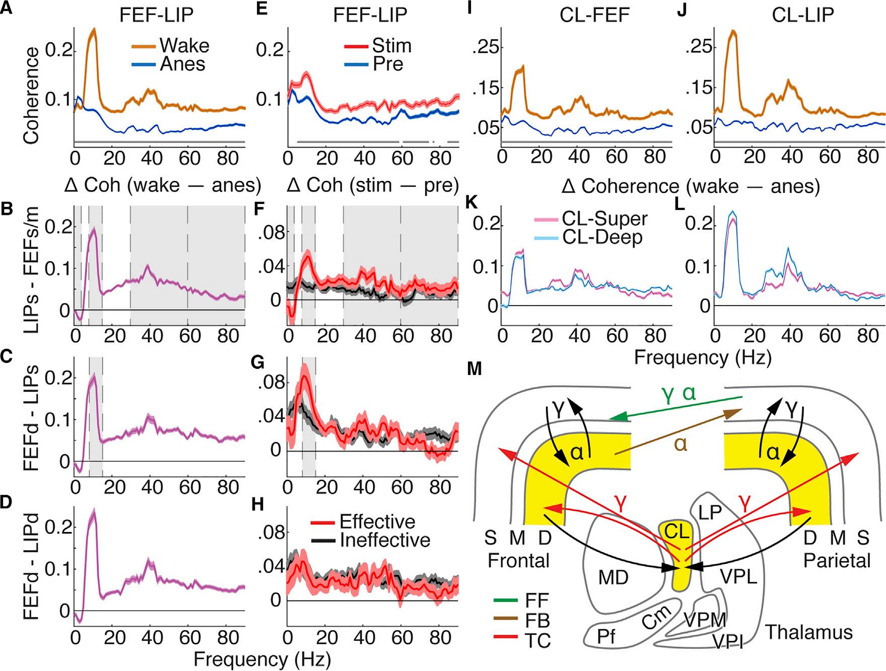 (IandJ)Populationthalamocorticalcoherencewith95%confidenceintervalsforwakeandanesthesiaacrossallpairedCL-FEF(I)andCL-LIP(J)contacts. (KandL)Populationaveragethalamocorticalcoherencedifference,wake–anesthesia,with95%confidenceintervalsofttests.CL-superficialandCL-deep layersfor(K)FEFand(L)LIP.