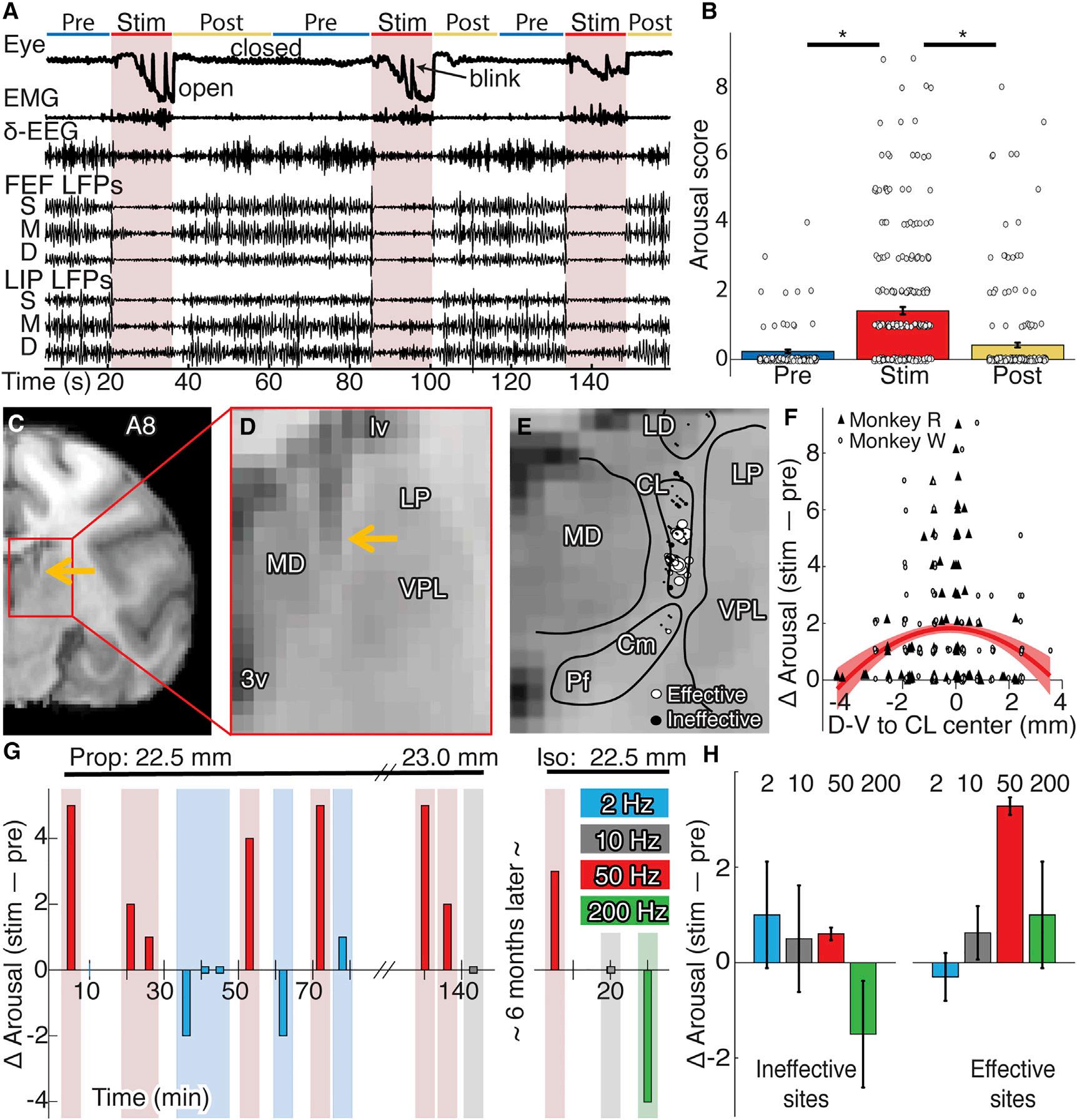 (F)Stimulation-inducedarousalchange(scoreduringstim–pre)asafunctionofthedorsal-ventraldistancefromCLcenter.Symbolsshowstimulationeventsby monkey;theredcurveshowsthequadraticfit(±SE).