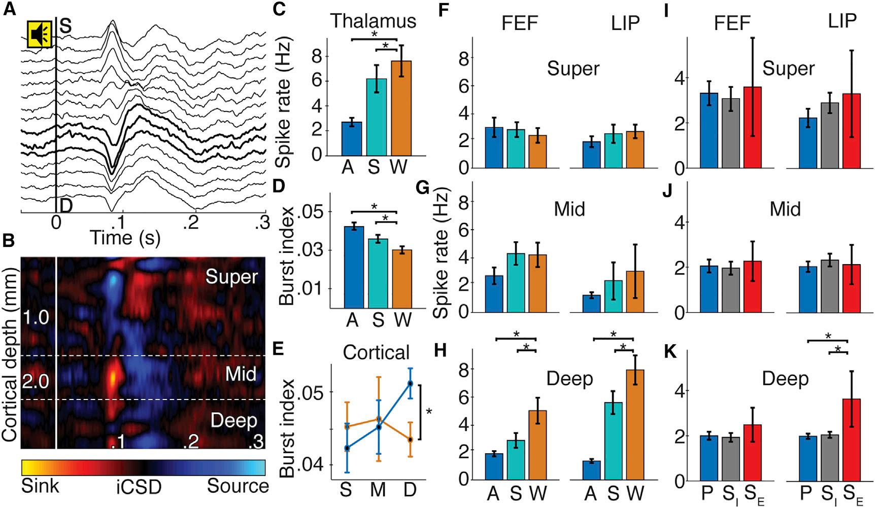 Figure2.ConsciousnessLevelModulatedSpikeRateandTiminginDeepCorticalLayersandCL (A)Exampleofsound-alignedevokedpotentialsfromlinearmulti-electrodearrayinFEF.Toneonsetat0s.BoldlinesshowinverseCSD(iCSD)-defined middlelayers. (B)Sound-alignediCSDcorrespondingto(A).