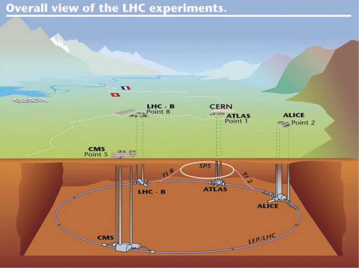 Fig.1.1 A3DlayoutoftheLHC,showingthelocationofthefourmajor experiments.ReprintedwithpermissionfromCERN. beonaverage25interactionseverybeamcrossing,mostofwhichwillberelatively uninteresting.Thehighluminosityforthemachineisneededtoproduceeventsfrom processeswithsmallcross-sections,forexampleinvolvingphysicsattheTeVscale.
