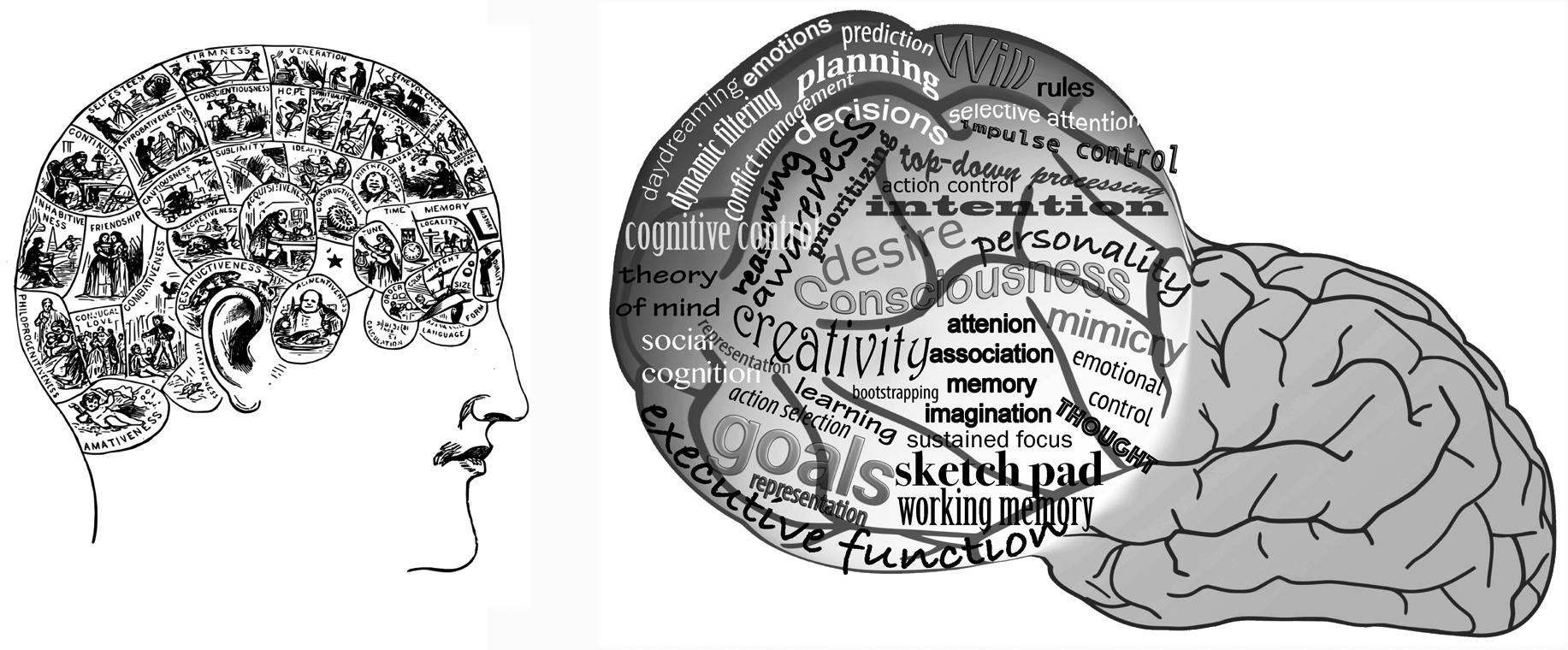 Figure 1.1. A: Franz Joseph Gall and his phrenologist followers believed that our various mental faculties are localized in distinct brain areas that could be identified by the bumps and uneven geography of the skull. Phrenology (or cranioscopy) is ridiculed as pseudoscience today. B: Imaging-based localization of our alleged cognitive faculties today. I found more than 100 cognitive terms associated with the prefrontal cortex alone, some of which are shown here.