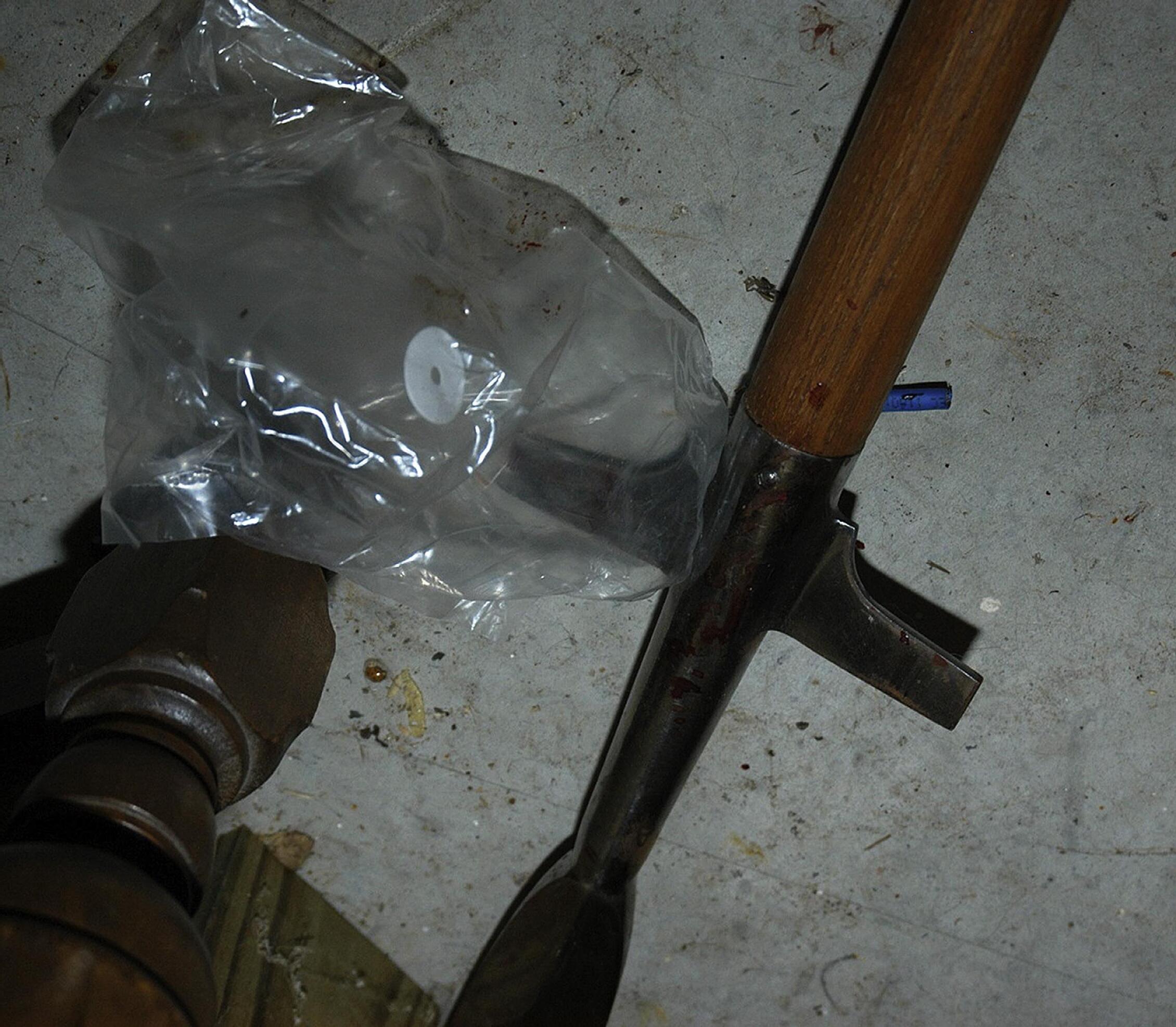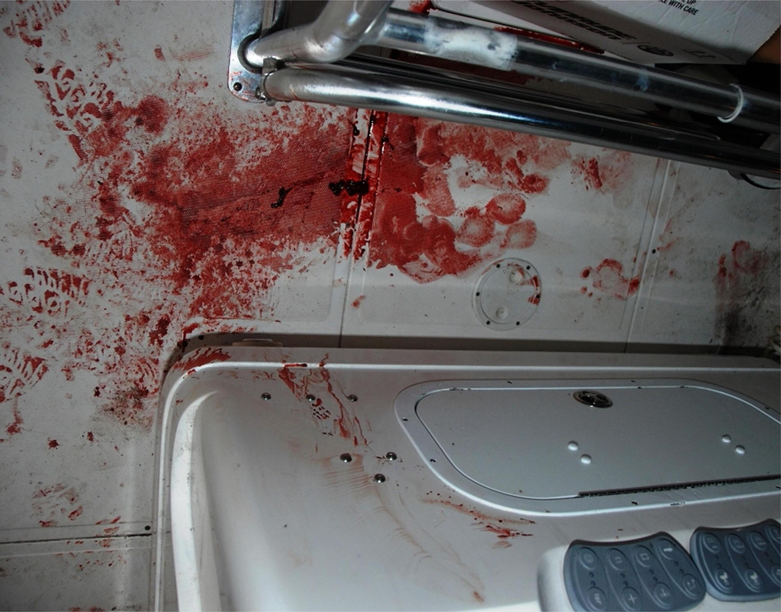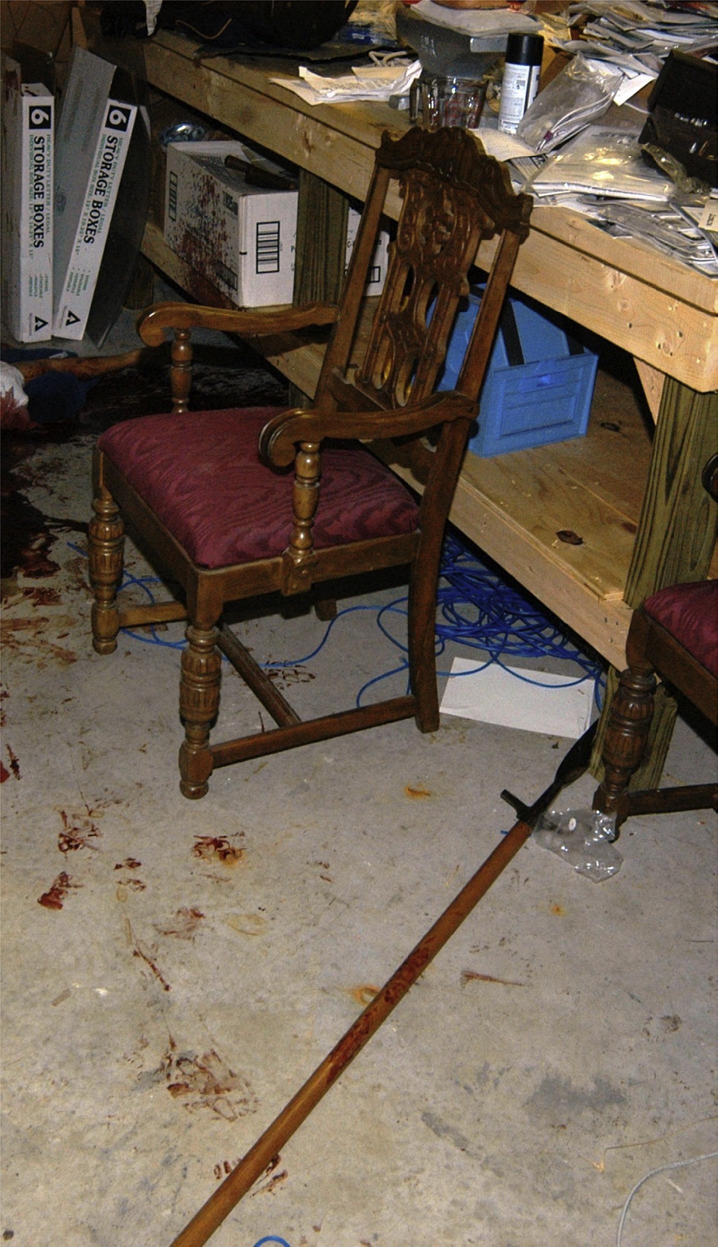 PHOTO 1.2 Victim’s blood on suspect’s shoes and shorts; blood on trunk liner from victim; trunk liner from car; impact spatter from victim in house.