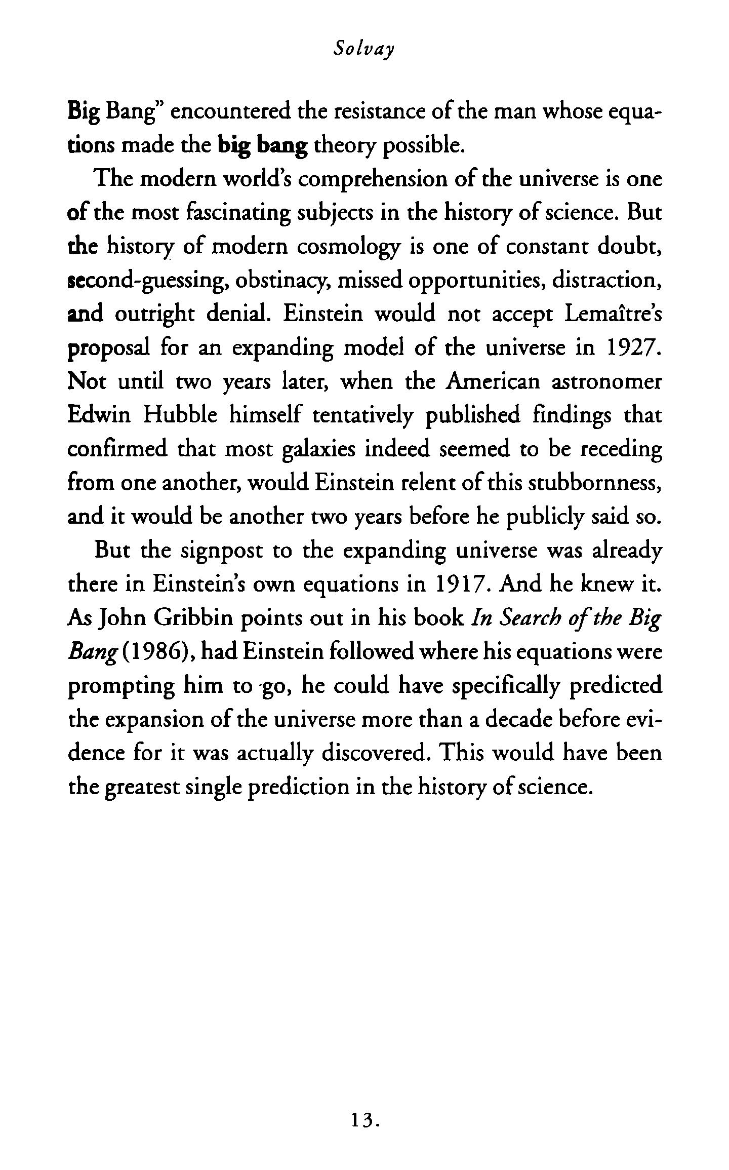 It was in Brussels, then, in the muddle of these preoccupations in the alleys of the Leopold Park that Georges Lemaitre found him. Einstein had heard of Lemaitre, of course. & he regarded the thirty-three-year-old diocesan cleric who caught up with him, he remembered the young man's paper. Theophile de Donder, one of the chairmen of the Solvay conference, had in fact showed it to him earlier in the year, probably at Lemaitre's request. It was a clever paper, Einstein could see that, but it reminded him of another he had seen some years before: a bothersome article by some Russian mathematician containing disturbing solutions to his equations that not only argued that the universe of general relativity was dynamic-but also that it could actually expand. Einstein was not impressed.
