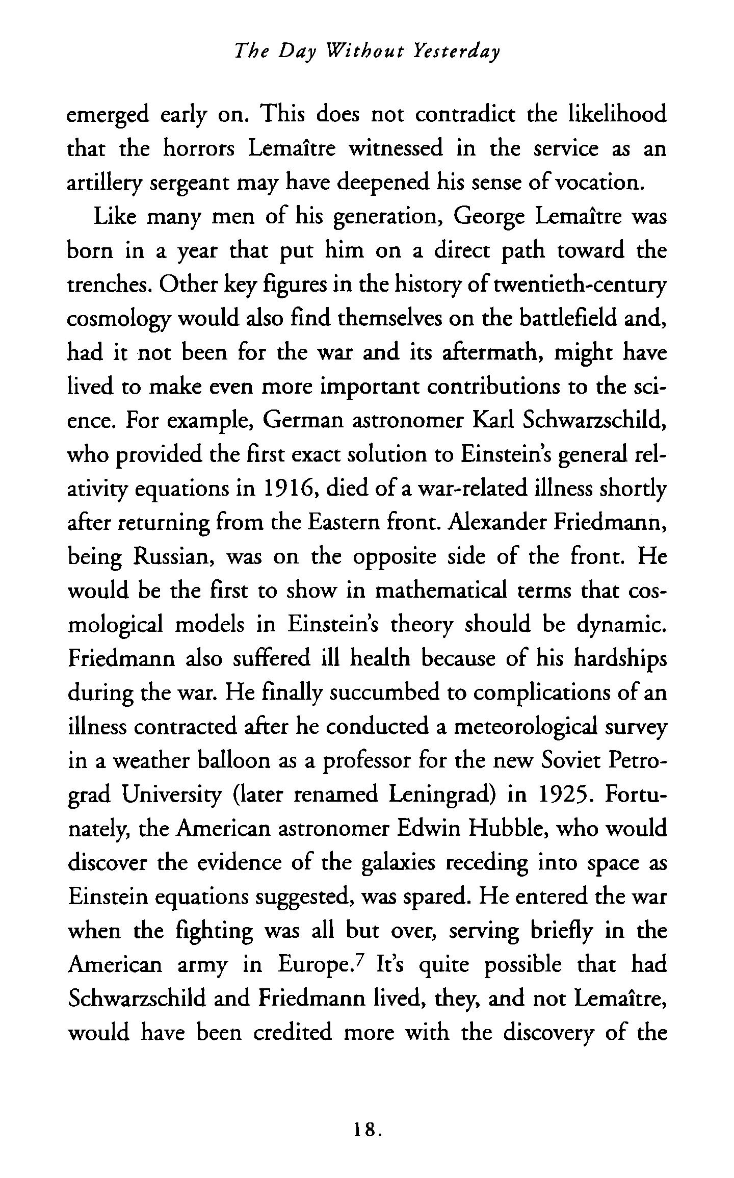 Like many men of his generation, George Lemaitre was born in a year that put him on a direct path toward the trenches. Other key figures in the history of twentieth-century cosmology would also find themselves on the battlefield and, had it not been for the war and its aftermath, might have lived to make even more important contributions to the science. For example, German astronomer Karl Schwarzschild, who provided the first exact solution to Einstein's general relativity equations in 1916, died of a war-related illness shortly after returning from the Eastern front. Alexander Friedmann, being Russian, was on the opposite side of the front. He would be the first to show in mathematical terms that cosmological models in Einstein's theory should be dynamic. Friedmann also suffered ill health because of his hardships during the war. He finally succumbed to complications of an illness contracted after he conducted a meteorological survey in a weather balloon as a professor for the new Soviet Petrograd University (later renamed Leningrad) in 1925. Fortunately, the American astronomer Edwin Hubble, who would discover the evidence of the galaxies receding into space as Einstein equations suggested, was spared. He entered the war when the fighting was all but over, serving briefly in the American army in Europe.? It's quite possible that had Schwarzschild and Friedmann lived, they, and not Lemaitre, would have been credited more with the discovery of the 18.