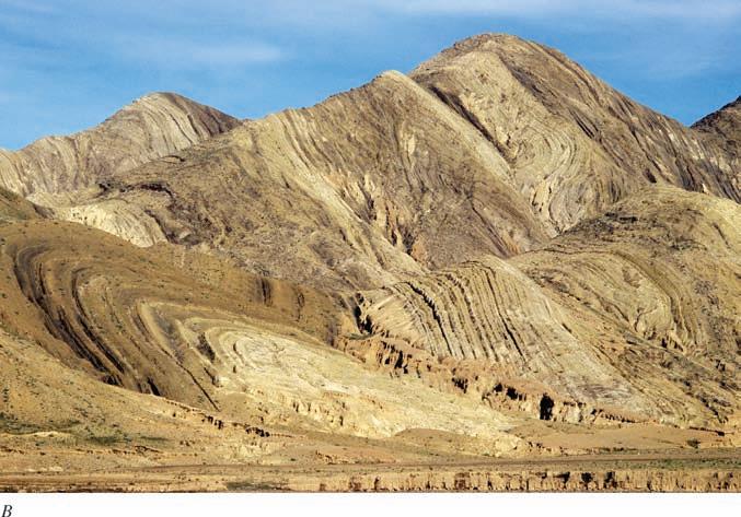 FIGURE2-3 Principleof superposition.(A)Exampleofa superpositionalsequenceof undisturbedTriassicandJurassic stratainCapitalReefNational Monument,Utah. ? Isthegreen shalerelativelyyoungerorolderthan thegrayrocklayerbeneathit? (B) Stronglyfoldedstratainthe HimalayanMountainsofTibet.It isoftendifficulttorecognizethe originaltopsandbottomsofrock layers.Geologistslookforbedding featurestohelpthemmakethe distinction. ? Ifageologistwas unabletotellthetopfromthebottomof bedsinanoutcropofseveralbeds,how mightthataffecthisinterpretationof theageofthestratafrombottomto top?(Answerstoquestionsabout figurescanbefoundintheStudent StudyGuide).((A)USGS,(B)Peter L.KresanPhotography)