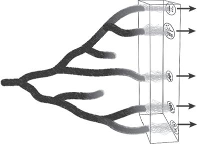 These processes together shape the large-scale dynamics of branching and expansion across the whole tree of life. Zooming out to a distance at which species themselves appear as points, whole groups of species rise and fall via chance, new innovations, or as conditions change (Fig. 1.2). We normally view this through the murky glass of the fossil record or phylogenetic reconstruction, but from our idealized viewpoint we can see the detailed dynamics of species origination and extinction as branching patterns on the tree. The pattern of growth and decline in numbers of species is not independent between groups, but can depend on ecological interactions between species making up those major clades.
