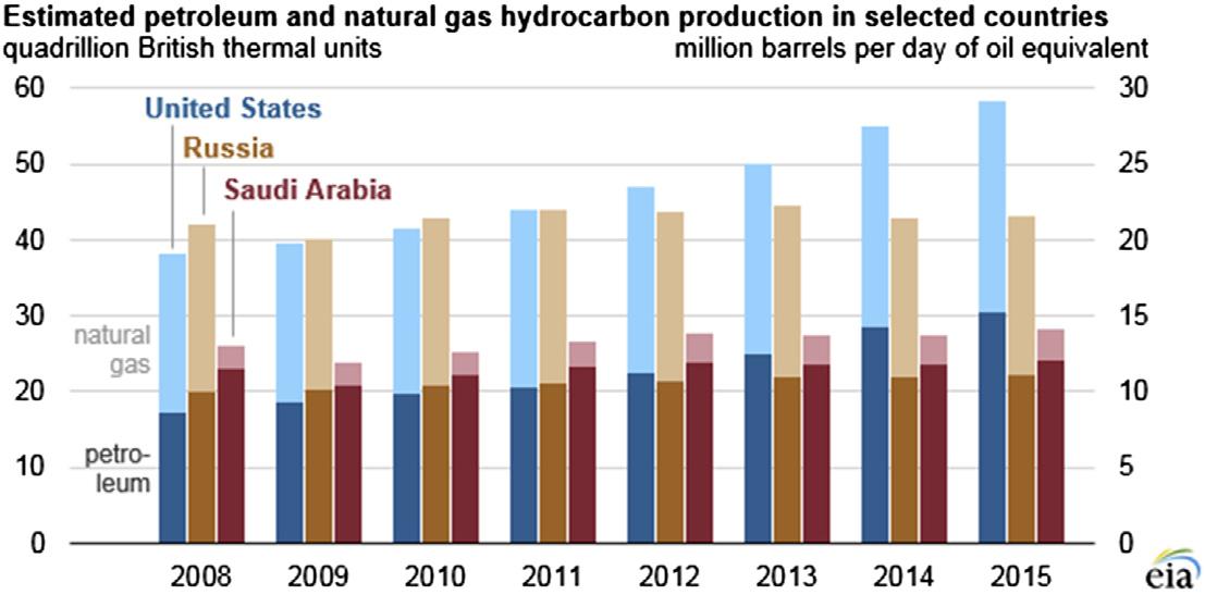 FIGUREI.4 Trendsinworldoilandgasproductionbytopproducers. ReproducedfromU.S.EnergyInformation Administrationwebpage(https://www.eia.gov/todayinenergy/detail.php?id¼36292)datedMay21,2018.