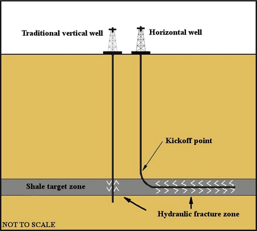 FIGUREI.3 Illustrationofthecombinationofhorizontaldrillingandstagedhydraulicfracturingtechnologyused forshalegas.Nottoscale. ModifiedfromSoeder,D.J.,Kappel,W.M.,2009.WaterResourcesandNaturalGas ProductionfromtheMarcellusShale,U.S.GeologicalSurveyFactSheet2009 3032,6p.