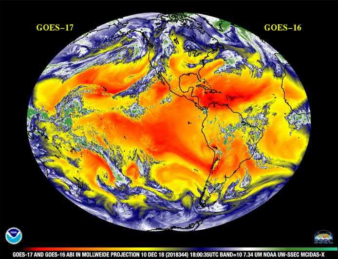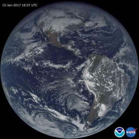 FIG. 2.5 Enhanced color image of reflected visible radiation sensed by GOES-16 on January 15, 2017, in which the light areas are associated with clouds or snow/ice and dark areas with warmer surface or near surface features. The continental outlines of North and South America can be discerned.