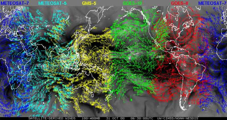 FIG. 2.3 In the 1990s, five geostationary imagers were routinely being used to provide near global coverage in the tropics and mid-latitudes of cloud tracked atmospheric motion vectors (AMVs). This example from October 31, 2000 shows AMVs derived from half hourly sequences of images from Meteosat-7, -5, GOES-10, -8, and GMS-5.