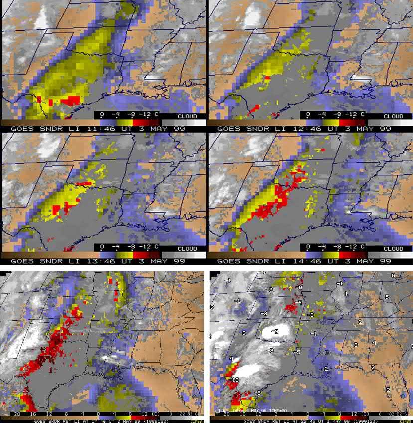 This sequence of the GOES lifted index (LI) derived product images (DPI, showing sounding values in clear skies and cloud temperatures elsewhere) at hourly intervals (upper four panels) from 11:46 UTC to 14:46 UTC May 3, 1999 over the western plains shows strong destabilization in southern Texas feeding into Oklahoma as LI values of 8 to 12°C in red expand their extent. The unstable air in southern Texas at the beginning organizes into a line of instability from western Texas into central Oklahoma. Later in the day, GOES LI DPI for 17:46 UTC (lower panel left) and 22:46 UTC (lower panel right) show the line of instability has extended into Nebraska at 17:46 UTC and the most unstable air is moving northeast and foreshadowing the deep convective clouds apparent at 22:46 UTC. A tornado touched down at 23:00 UTC in Oklahoma City (where the radiosonde LI value at 00:00 UTC indicates 9°C). Radiosonde LI determinations at 00:00 on May 4, 1999 (superimposed on the GOES LI DPI of 22:46 UTC) show very unstable air (LI of 4 to 10°C) across Nebraska, Oklahoma, and Texas.