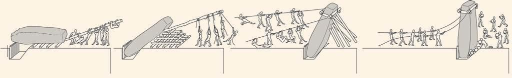 Figure 0.14 Hypthetical construction of Stonehenge. Above: raising the megaliths into an upright position by way of levers, ropes, and piled logs. Below: raising a lintel to the top of two sarsens by way of a working platform of stacked timbers.