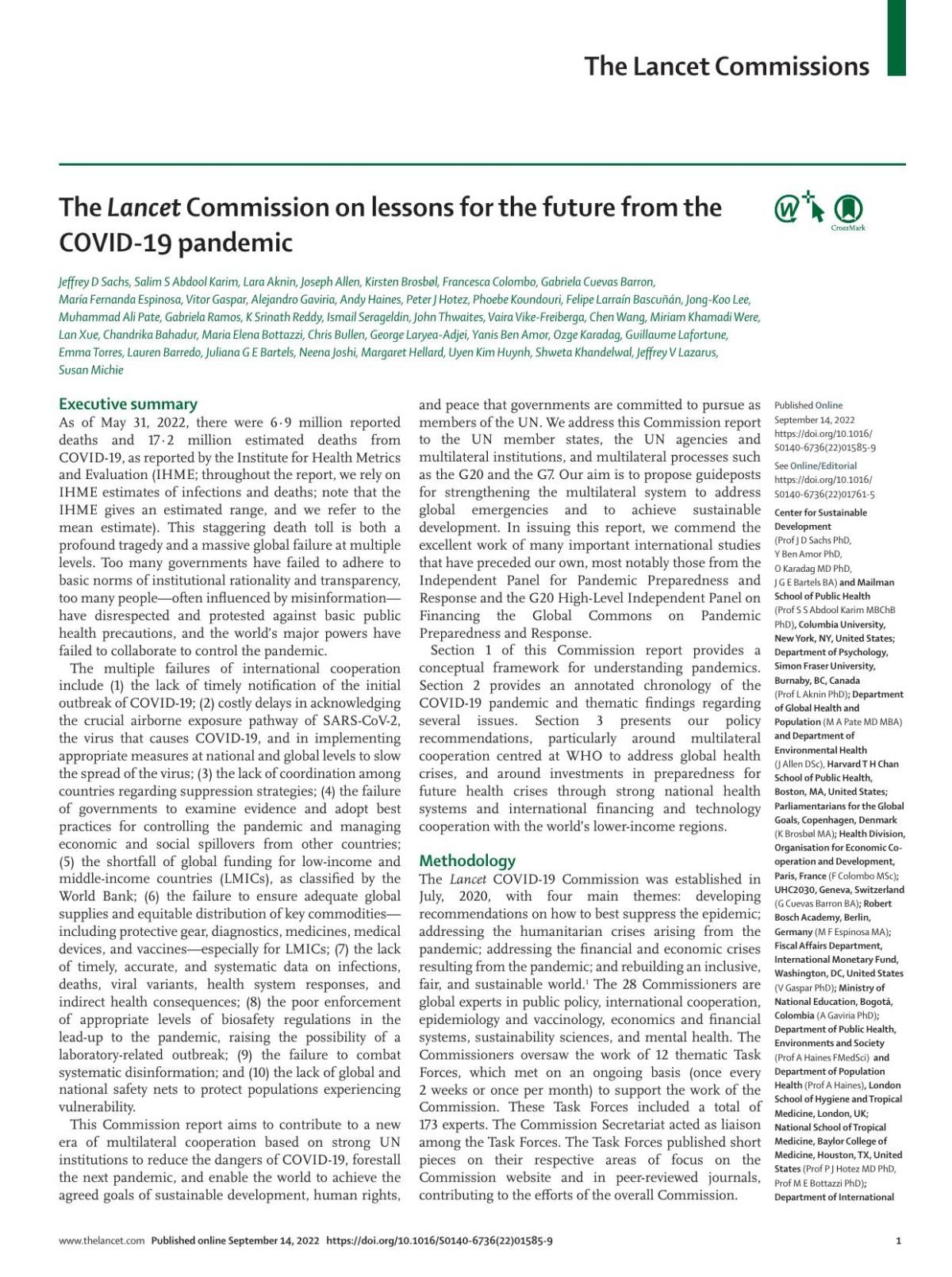 The Commission issued its first statement in The Lancet2 on the occasion of the UN General Assembly on Sept 14, 2020. The second statement of the Commission was published in The Lancet3 on Feb 12, 2021, around the time of the launch of the global vaccination effort. In October, 2021, the Commission issued its third statement, directed towards the G20.4 For the final report of the Commission, each Task Force prepared a report drawing on original analysis and synthesis of evidence to generate recommendations relevant to their specific Task Force. Recommendations from these reports provide the basis for the Commission’s final report. Additionally, the Secretariat oversaw a detailed analysis of the key policy recommendations of other COVID-19 commissions, panels, and working groups. The Secretariat and members of the Task Forces then examined the best available syntheses of evidence to inform and test the key claims made in the report.