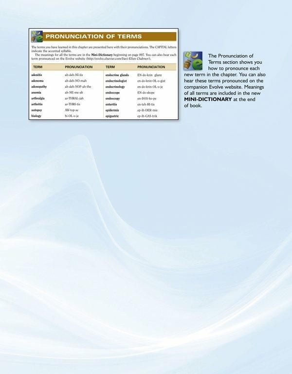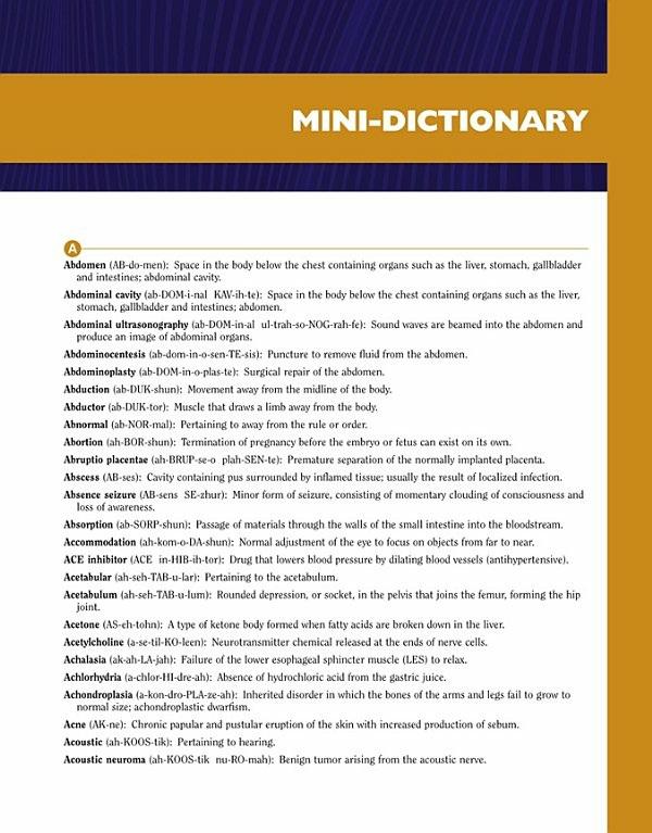 The biggest bonus for students and instructors is the brand new MINI-DICTIONARY at the end of the book. This is a complete list of all medical terms in the text with easy to understand explanations. My thought was to provide an immediate, convenient way for finding definitions, seeing pronunciations, and checking answers to all