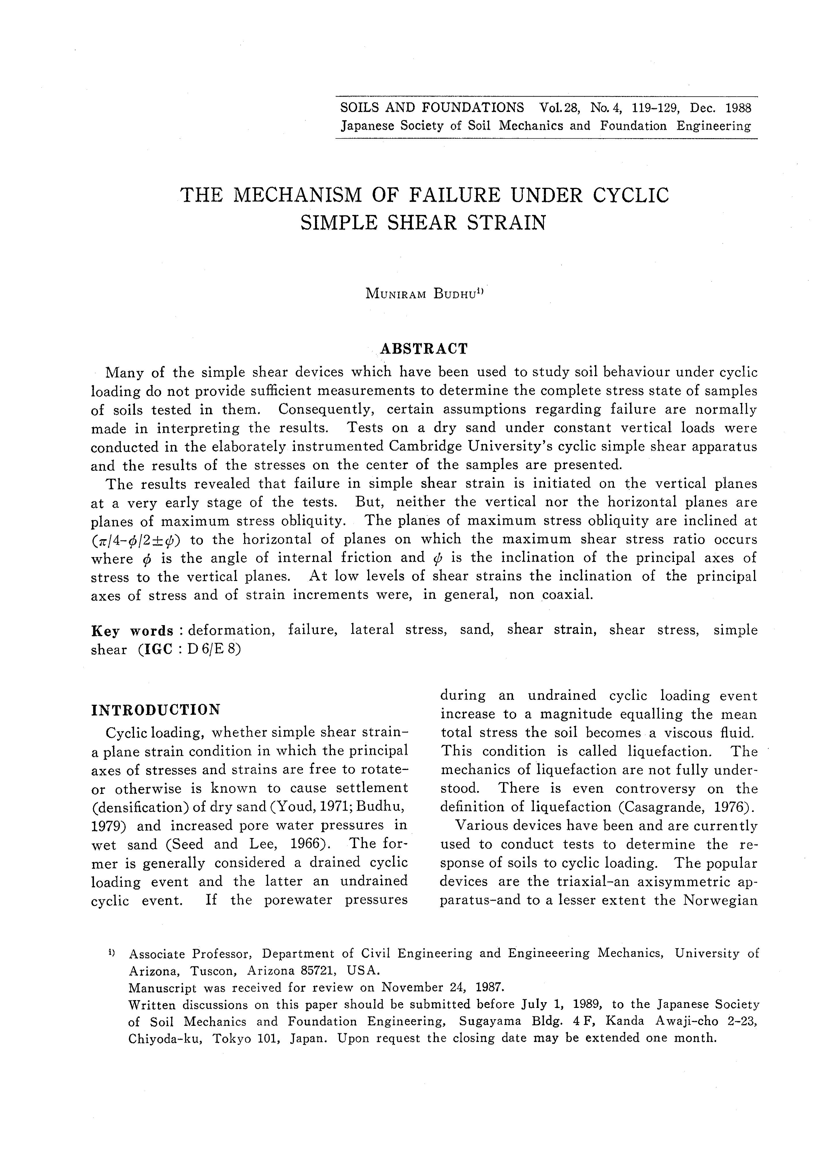 Geotechnical Institute (NGI) direct shear apparatus and the hollow cylinder apparatus. It has generally been accepted, however, that during an earthquake or during wave load ings an element of soil in the ground would be subjected to cyclic simple shear strain (Seed, 1979). Two types of simple shear devices-NGI (Bjerrum and Landva, 1966) and Cambridge (Roscoe, 1953) were originally developed to supposedly apply uniform simple shear strain to soil samples which were one dimensionally consolidated. The NGI type tests a cylindrical sample enclosed by a rubber membrane reinforced by a helical binding of wire. The Cambridge type tests a cuboidal sample within rigid boundaries. Both tus have been further developed for cyclic simple shear strain tests (for example, Budhu, 1984; Peacock and Seed, 1968).