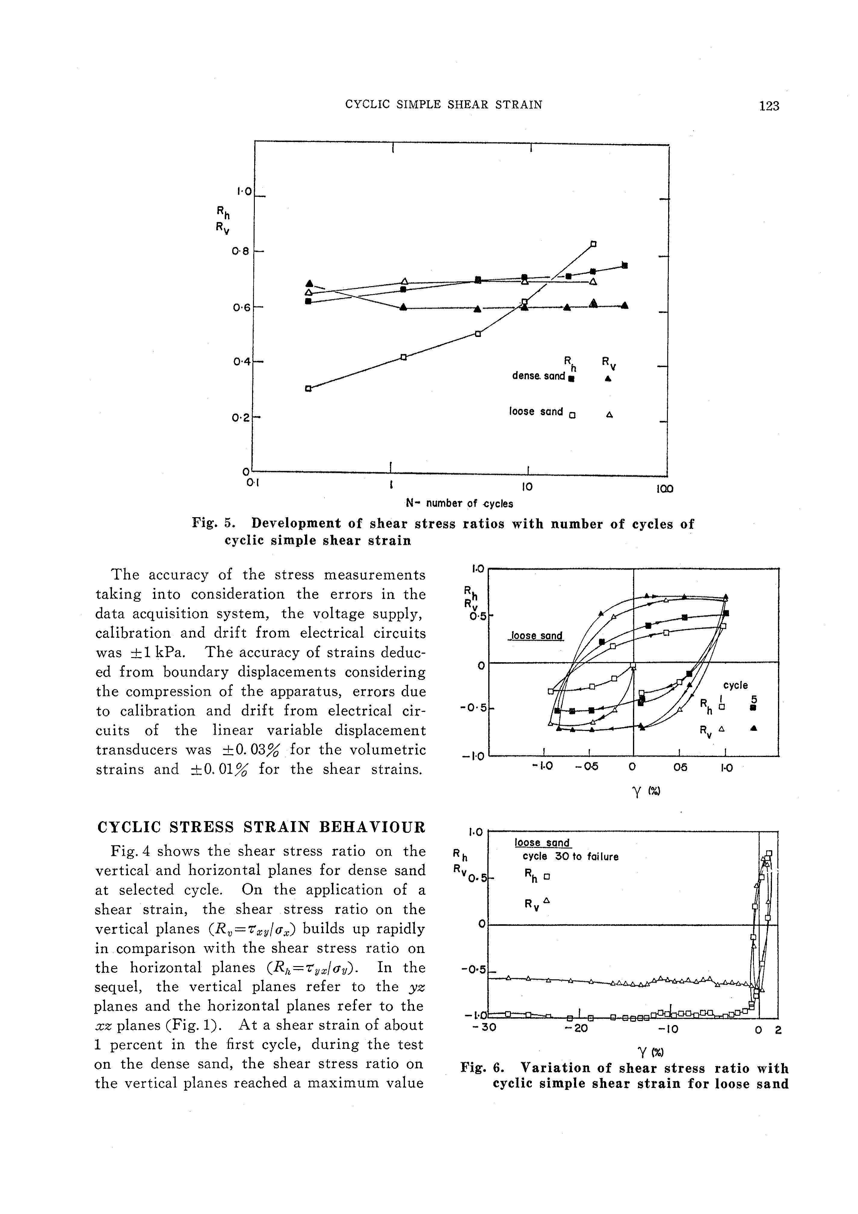Just after failure on the vertical planes was attained, a quantum jump in both lateral stress ratios (a xf ay and a zf ay) was observed. The intermediate principal stress (a z) builds up during shearing in the reverse direction in cycle 1 to a value equalling the vertical stress whilst ax exceeds the vertical stress by about 35 percent. During subsequent cycles a zf ay varies between 0. 8 and 1. 05 and a zf ay varies between 0. 7 and 1. 4. Similar behaviour was observed for the test on the loose sand.